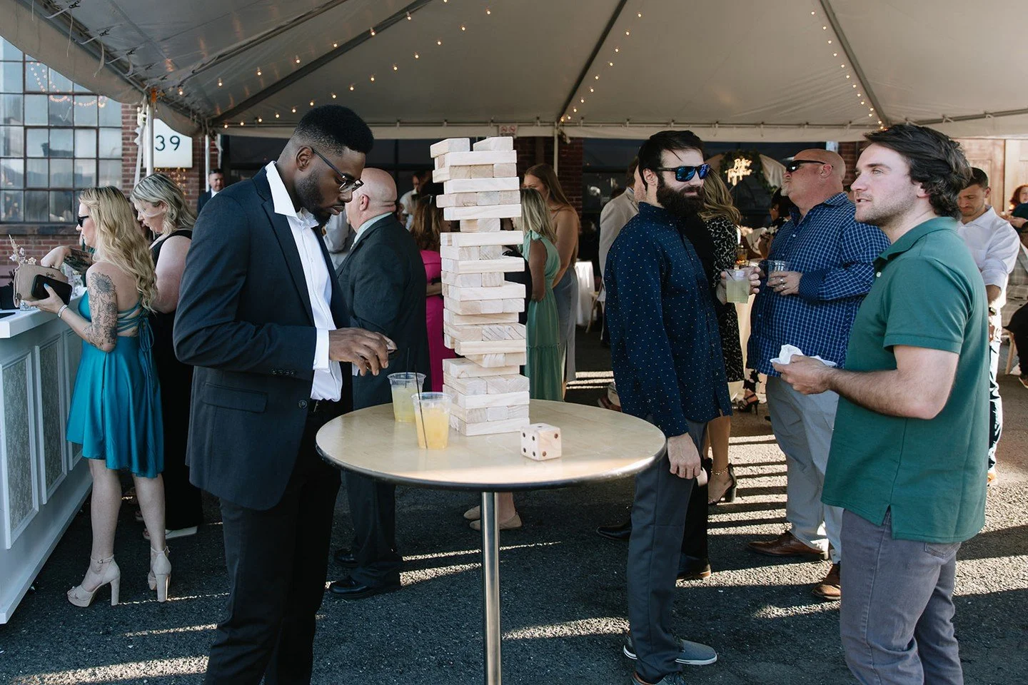 A seasonal 30×30 tent with string lights sits just beyond the venue’s large garage doors, and free parking is available for guests directly in front of the venue.